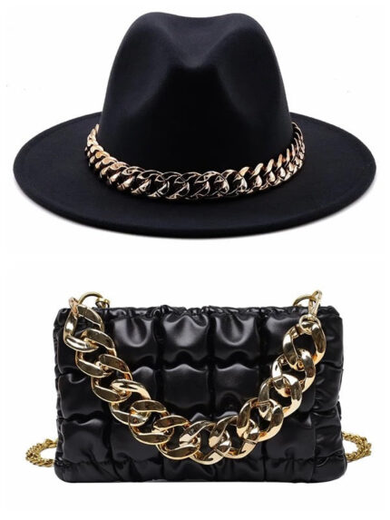 Top Pick Fedora With Large Chain And Bag Set Black