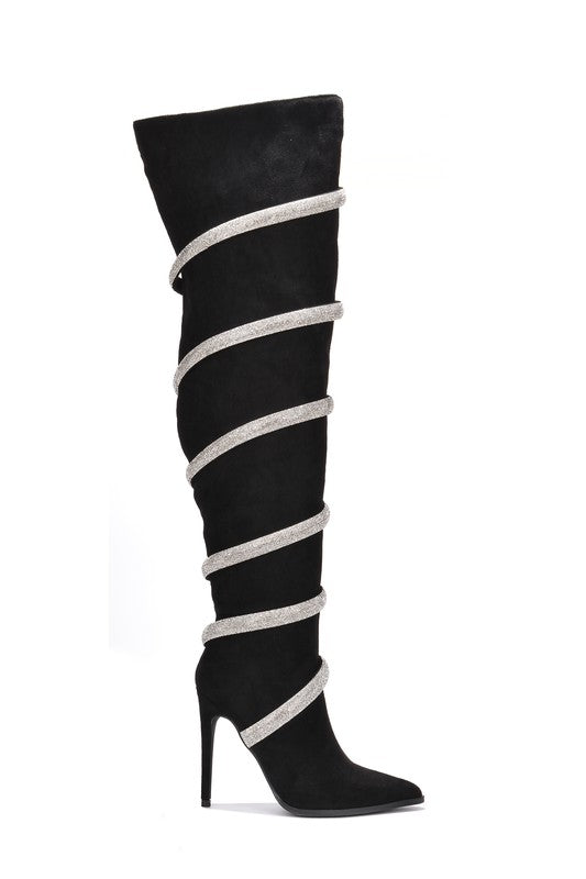 Thigh high boot. Pointed toe. Rhinestone embellished straps. Faux Suede material
